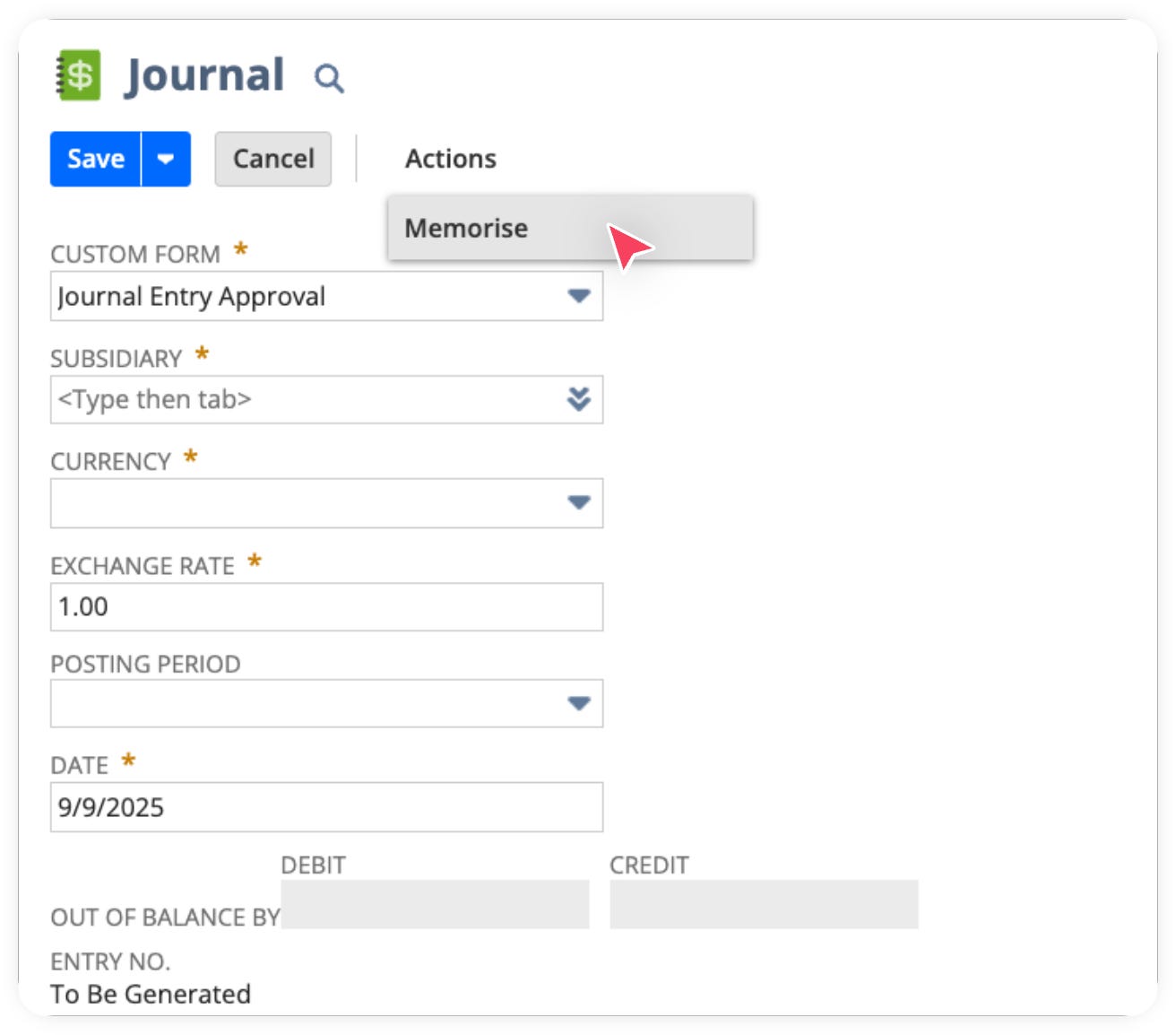 A Memorized Transaction is a saved transaction template that NetSuite can recreate on a schedule you define. Instead of re-entering the same data each time, you “memorize” the transaction once, and NetSuite will automatically create it going forward.