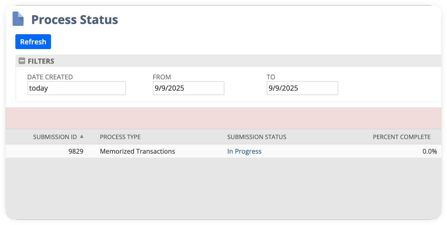 You can track the status of multiple memorized transactions by going to Transactions > Management > Enter Memorized Transactions > Status.