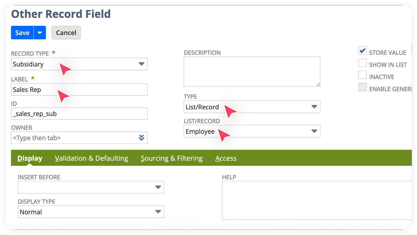 Create a custom field on the Subsidiary record to store the default Sales Rep. This will let us associate a default rep with each subsidiary.