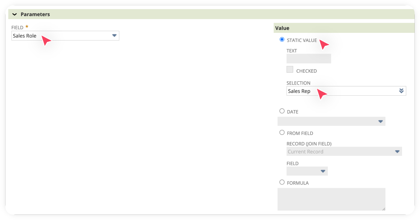Scroll down to the Parameters section, select Field as Sales Role, check Static Value and then set Selection as Sales Rep. Click Save.