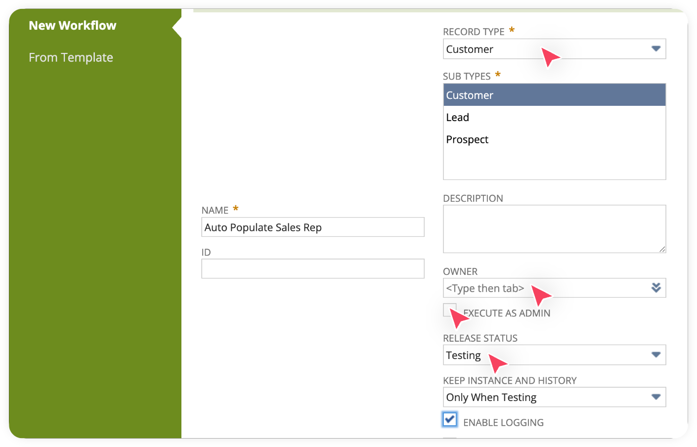 Enter Name, Record Type = Customer, Select Sub Types, Select Owner, Check Execute as Admin, Set Release Status = Testing (for now, we will make it released later) and Check Enable Logging.