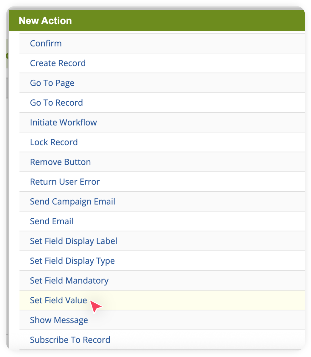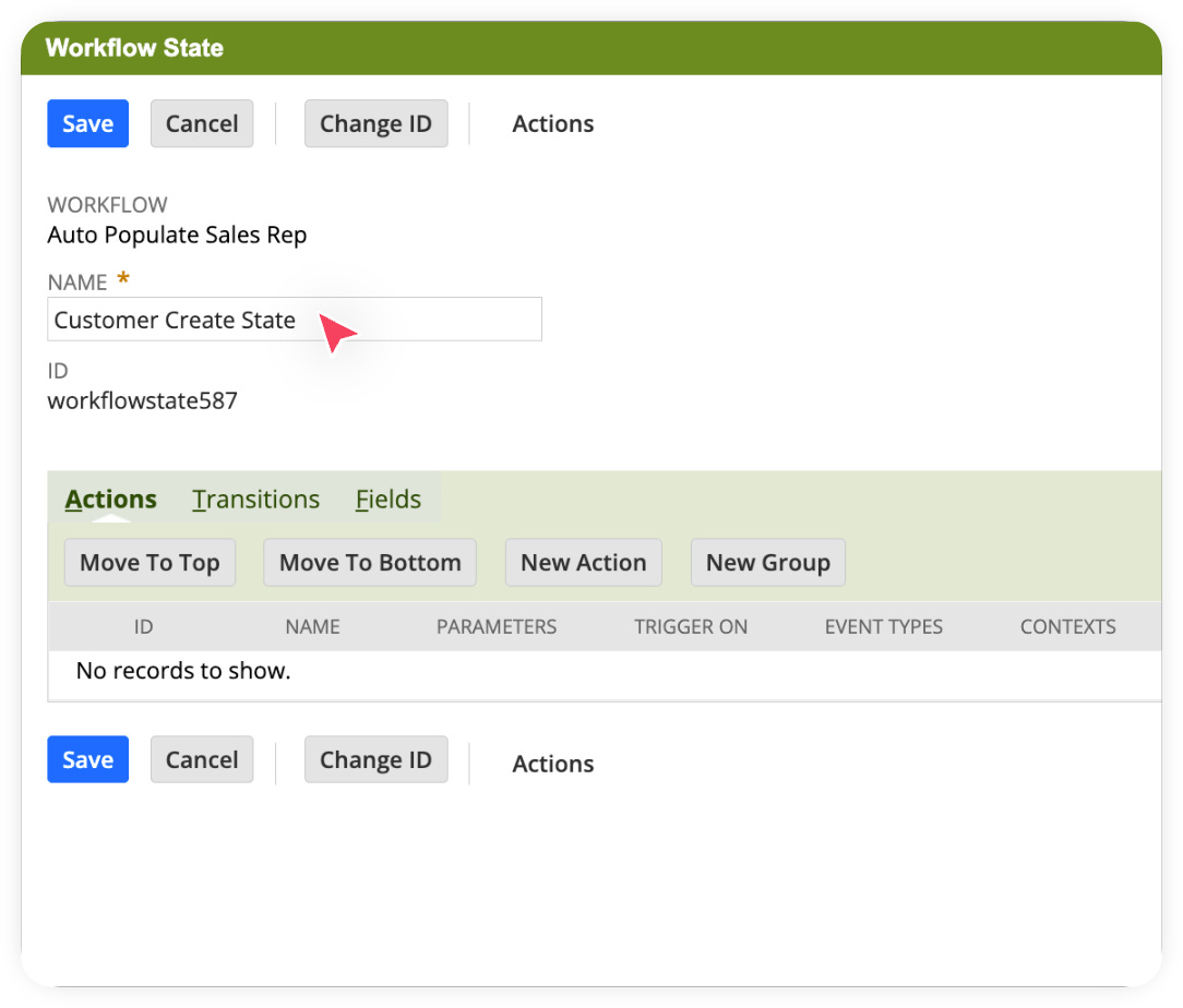 Now it’s time to add an Action. This is where we’ll configure the workflow to set the Sales Rep on the Customer record.