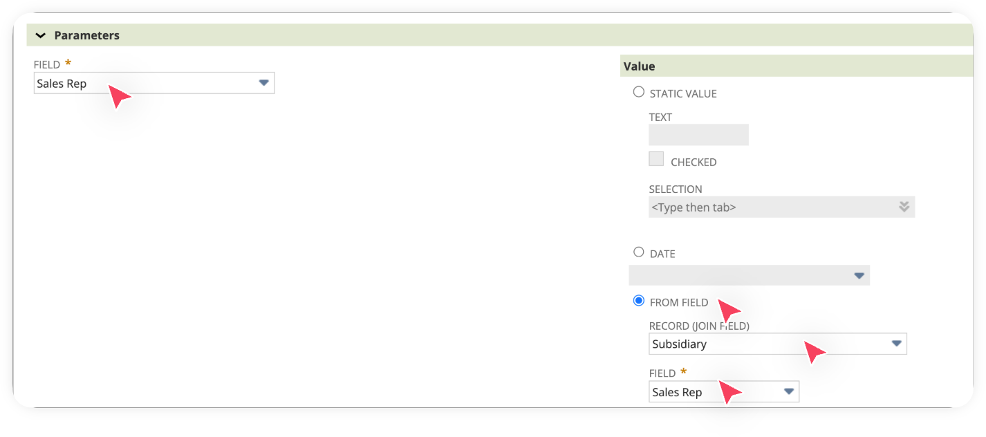 Scroll down to the Parameters section, select Field as Sales Rep, check From Field, then set Record (Join Field) to Subsidiary and choose Sales Rep as the field. Click Save.