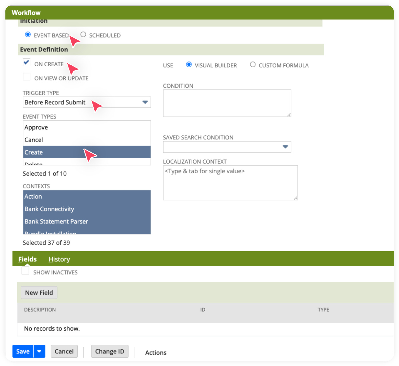 Now, Set Trigger On to Before Record Submit, Select Event Types as Create.