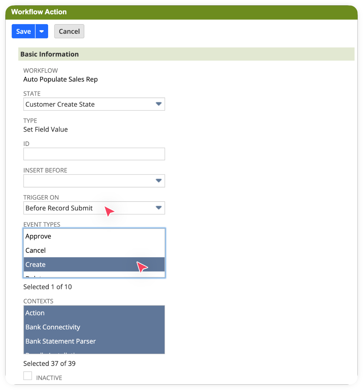 We also need to add another action to define the role for the Sales Rep. To do this, click New Action again under the State tab of the workflow. In the next screen, select Set Field Value. Now, Set Trigger On to Before Record Submit, Select Event Types as Create.