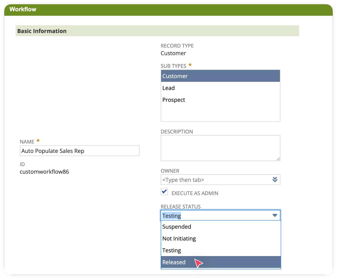 Important: If your workflow works as expected, go back to the workflow and change its status to Released. This will make it active and available for everyone else in the account.