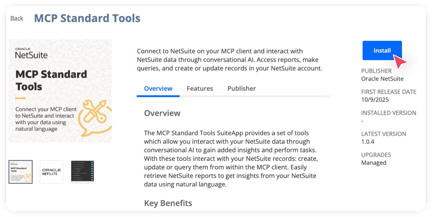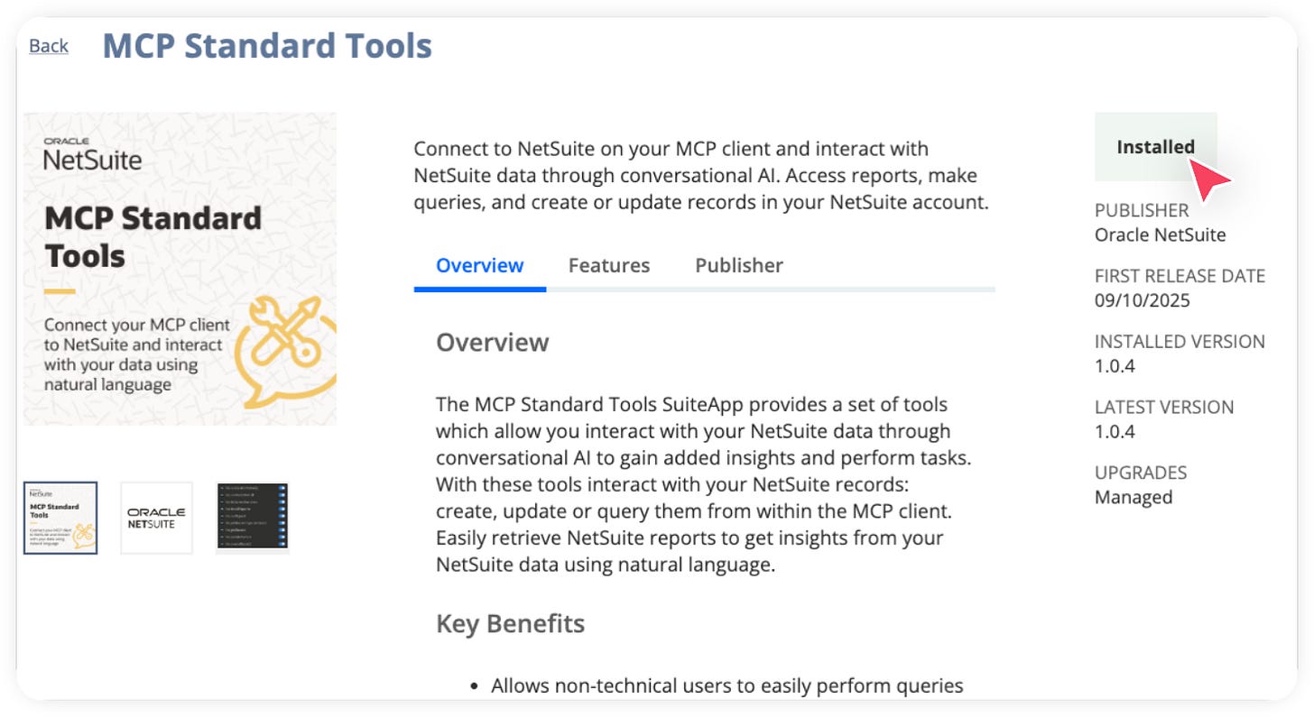 Now we have successfully installed the MCP Standards Tools SuiteApp. This SuiteApp sets up an MCP server within NetSuite allowing your AI model to securely connect and interact with your NetSuite account.