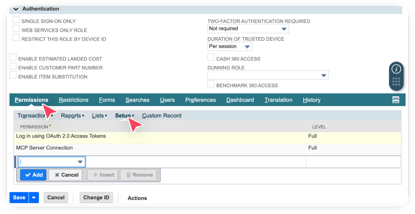 Scroll down to the Permissions section and, under the Setup subtab, ensure the following permissions are added. You should also assign additional permissions such as Customers, Transactions, and others depending on the type of data you want your AI model to access within NetSuite.