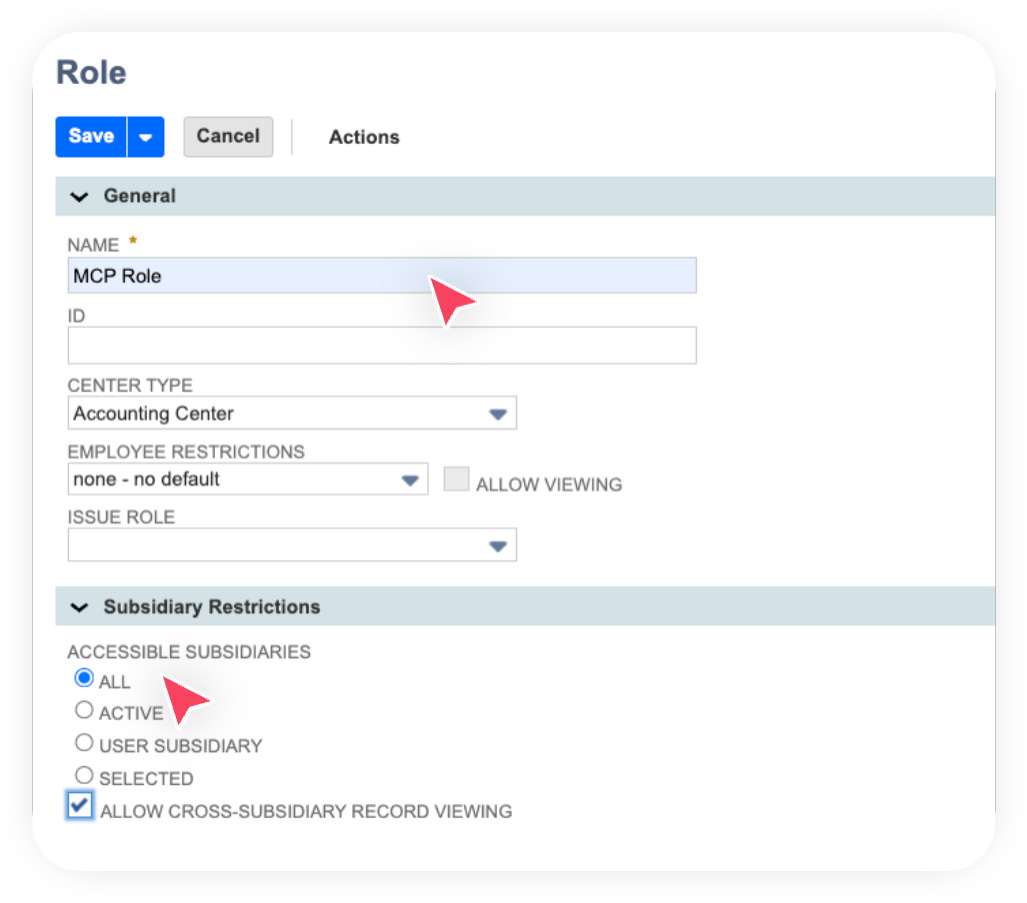 Give the role a clear name (for example, “MCP role”). Make sure to grant access to all subsidiaries if you don’t want the AI users to be limited to a single subsidiary.