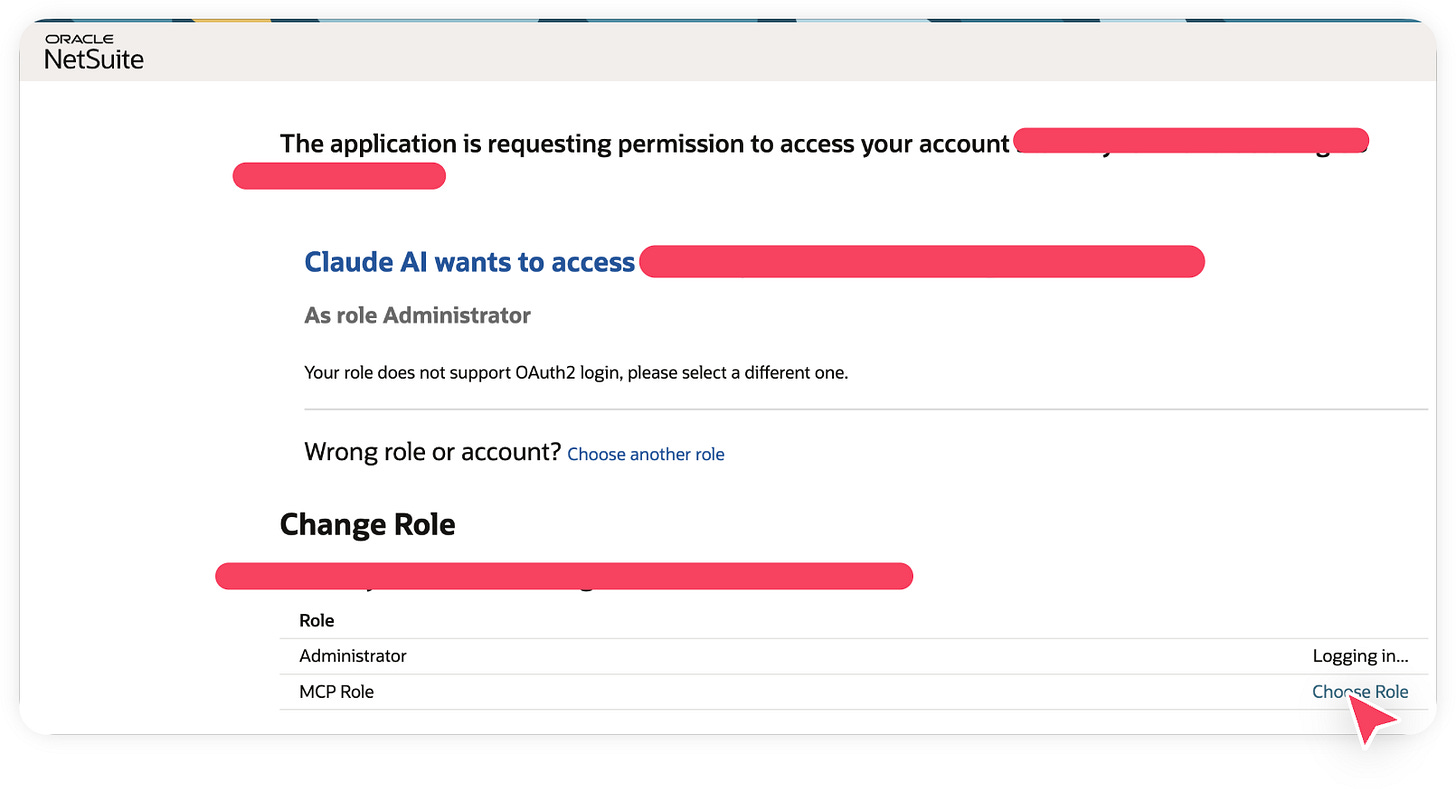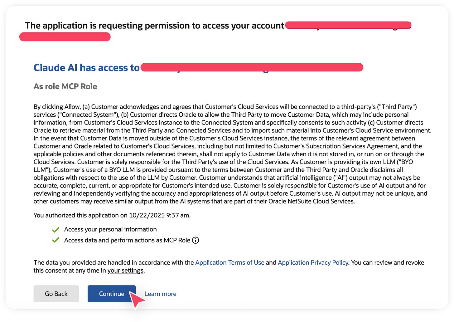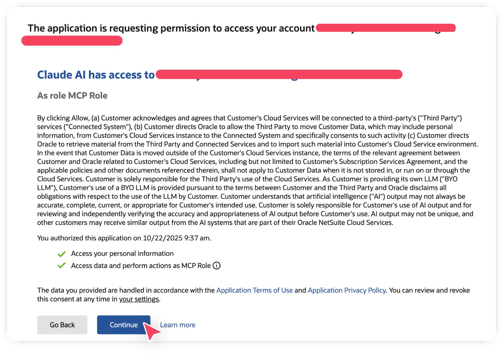 Now NetSuite will show a big scary message saying that you are giving a third party access to your account which can include viewing personal information and performing actions using the MCP role. This is normal and safe as long as the role you created has only the necessary and limited permissions. Click Allow.