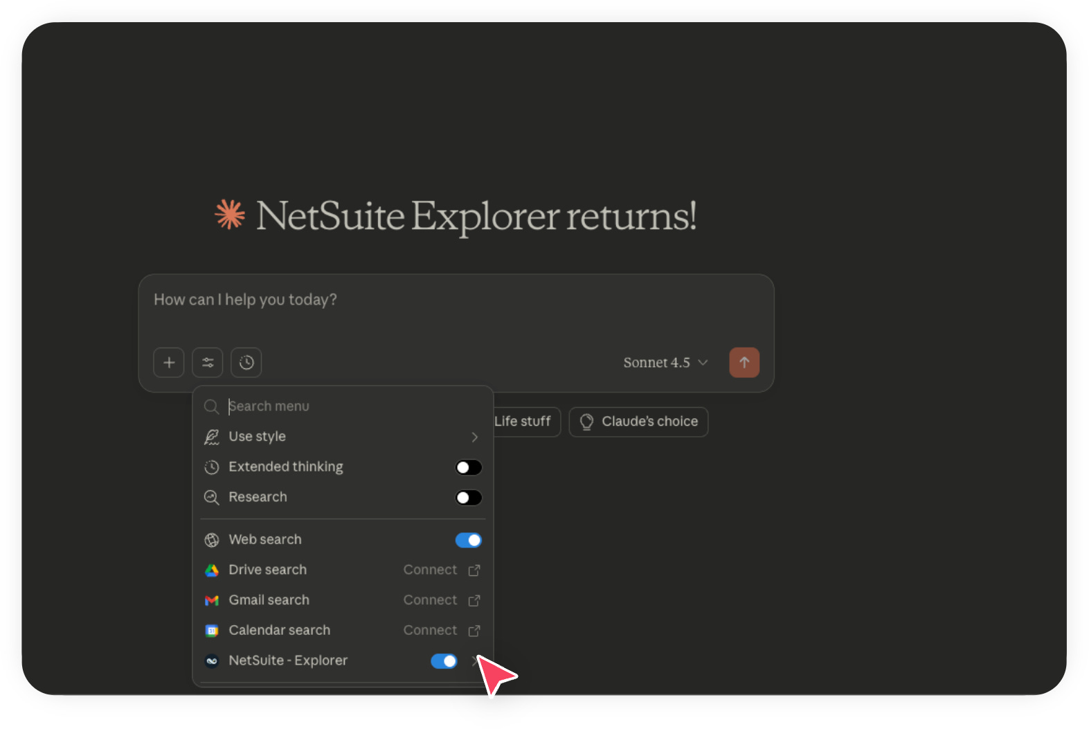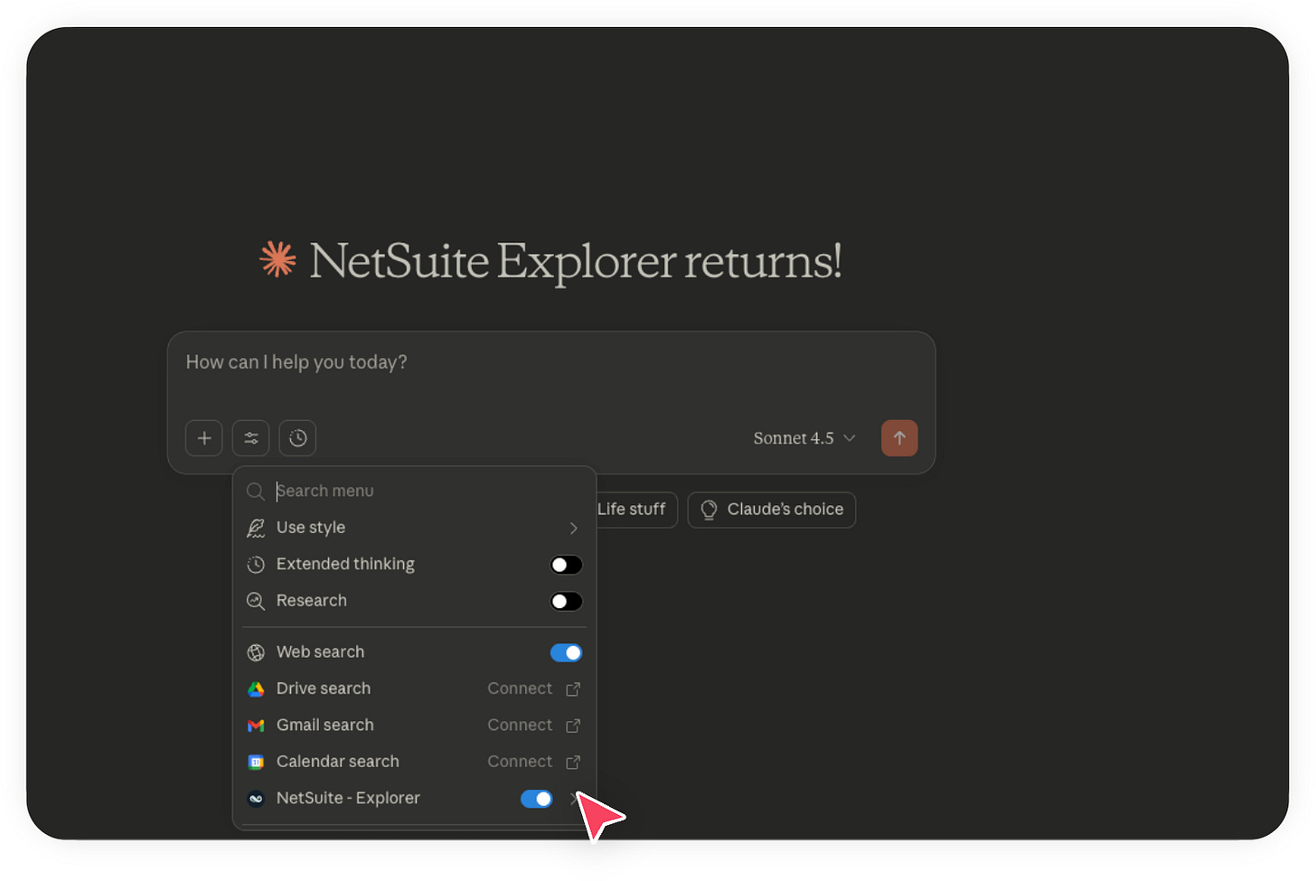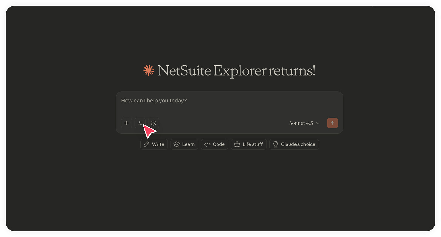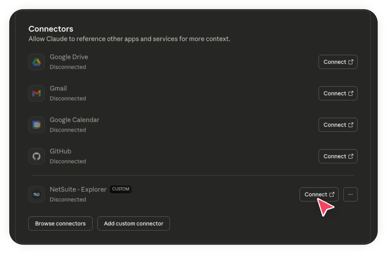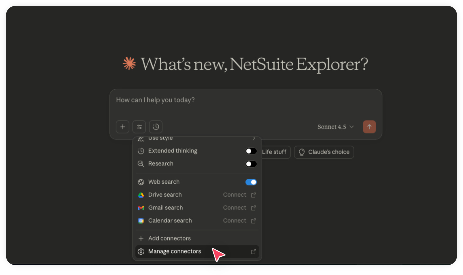 FYI, sometimes you might be redirected to a page that looks like an error. If that happens, just go back to Claude and check the Connectors section to confirm the connection. It may be an open bug with Claude.Go back to the home screen and click the Tools icon again. You should now see your NetSuite connector enabled.