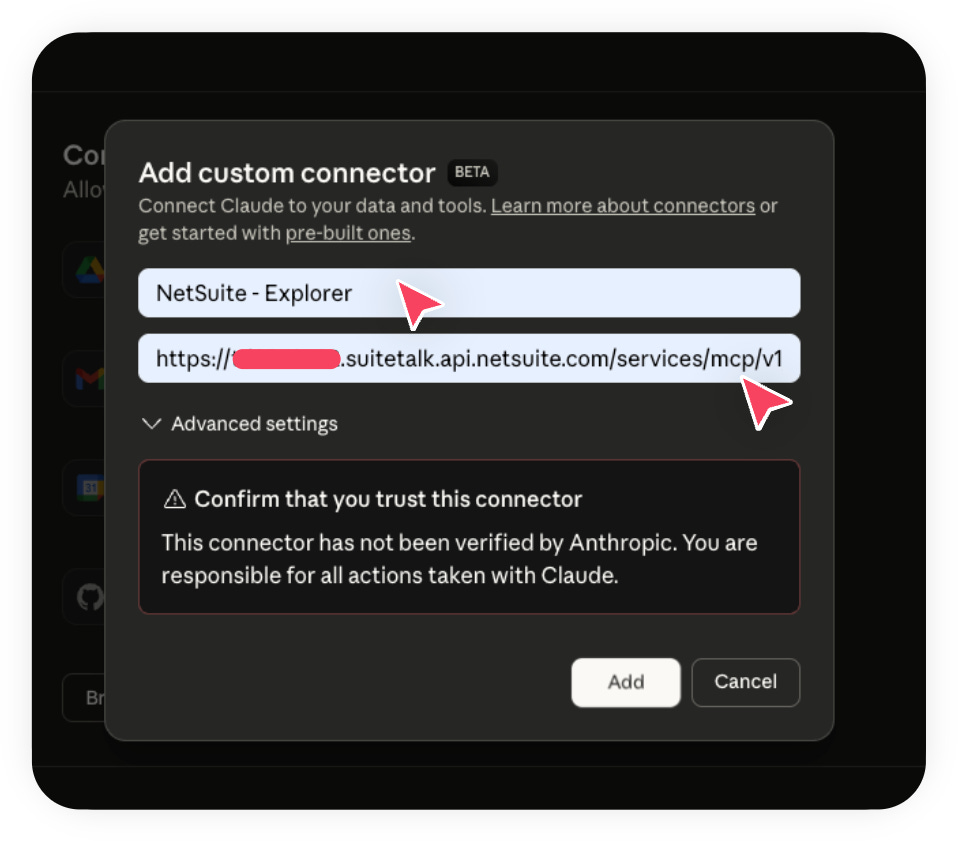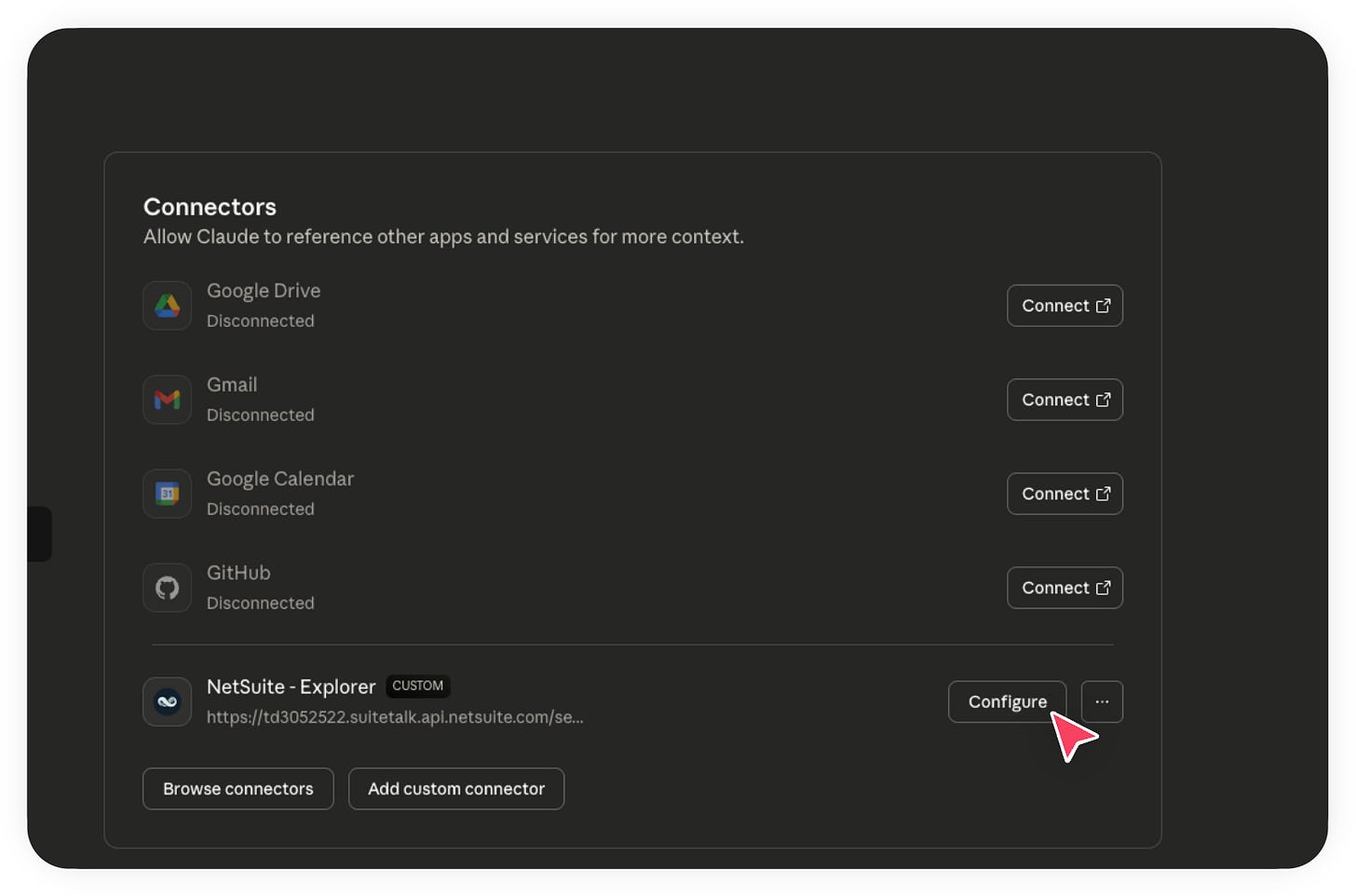 You should now be redirected back to Claude and you should see Configure next to your NetSuite Connector instead of Connect. This means the connection was successful.