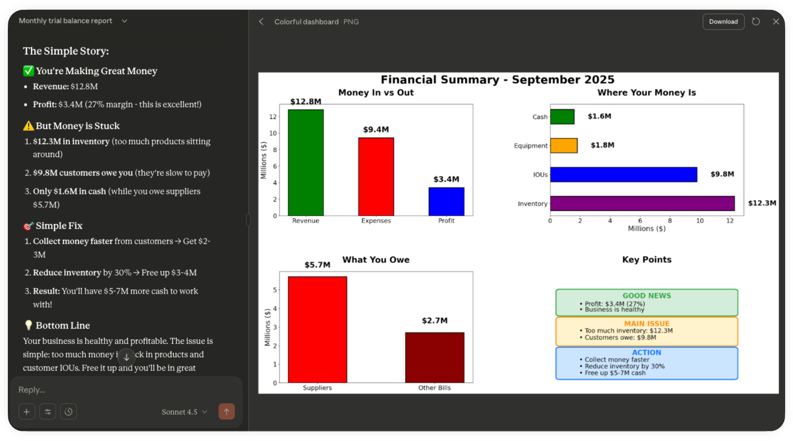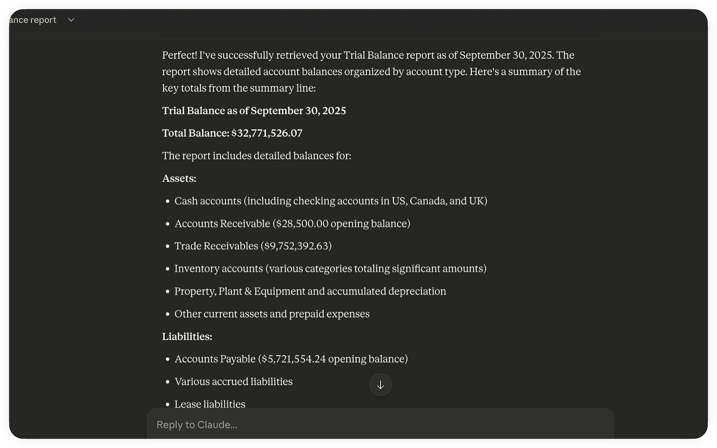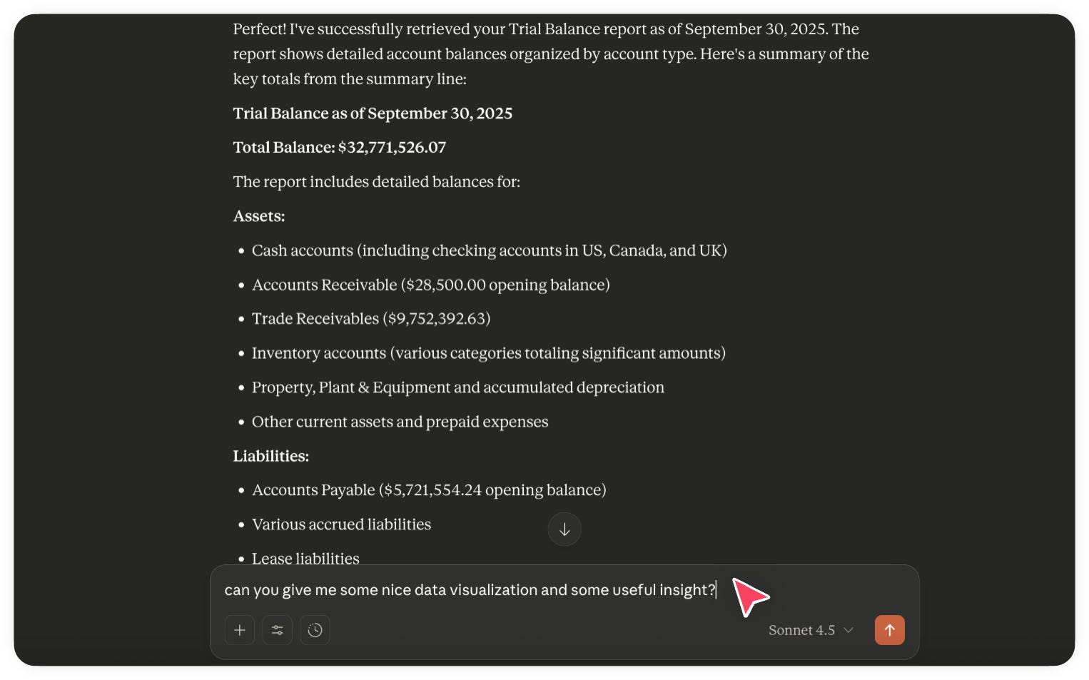 Next, we will ask Claude to generate a Trial Balance report and provide some analysis and recommendations based on the data. This will help us gain insights into our business performance and identify areas for improvement.
