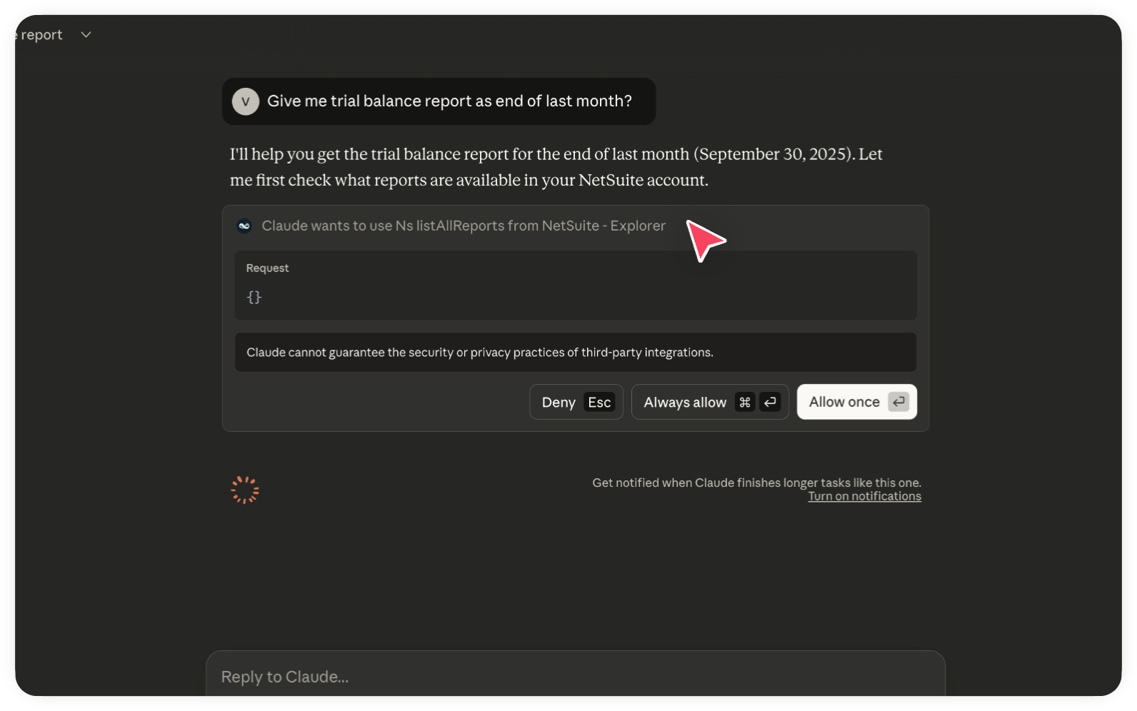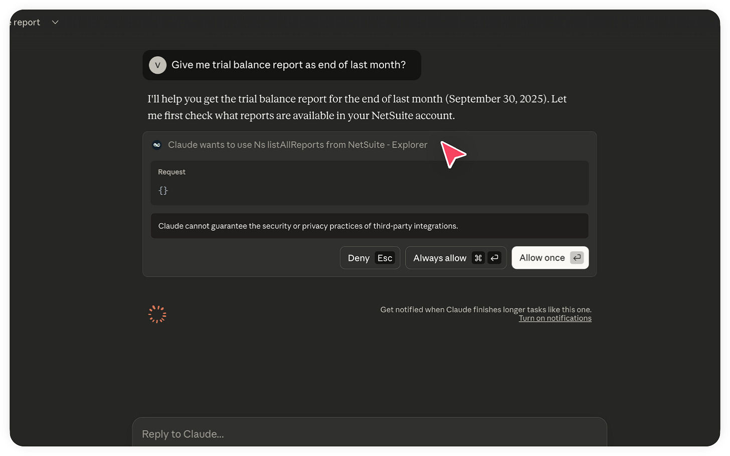 Claude will request your permission to perform certain actions in your NetSuite account. Read the request carefully and click Allow.