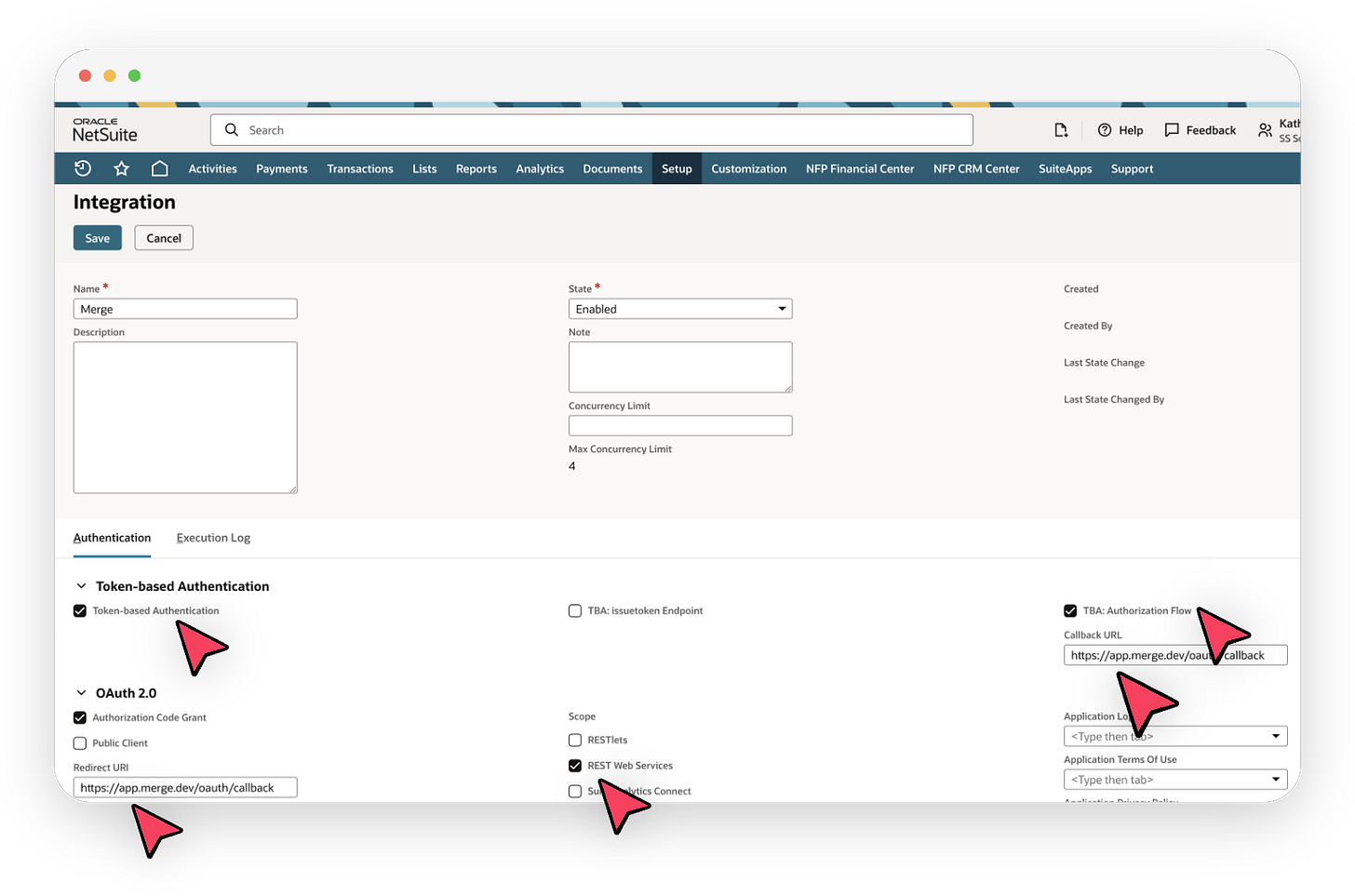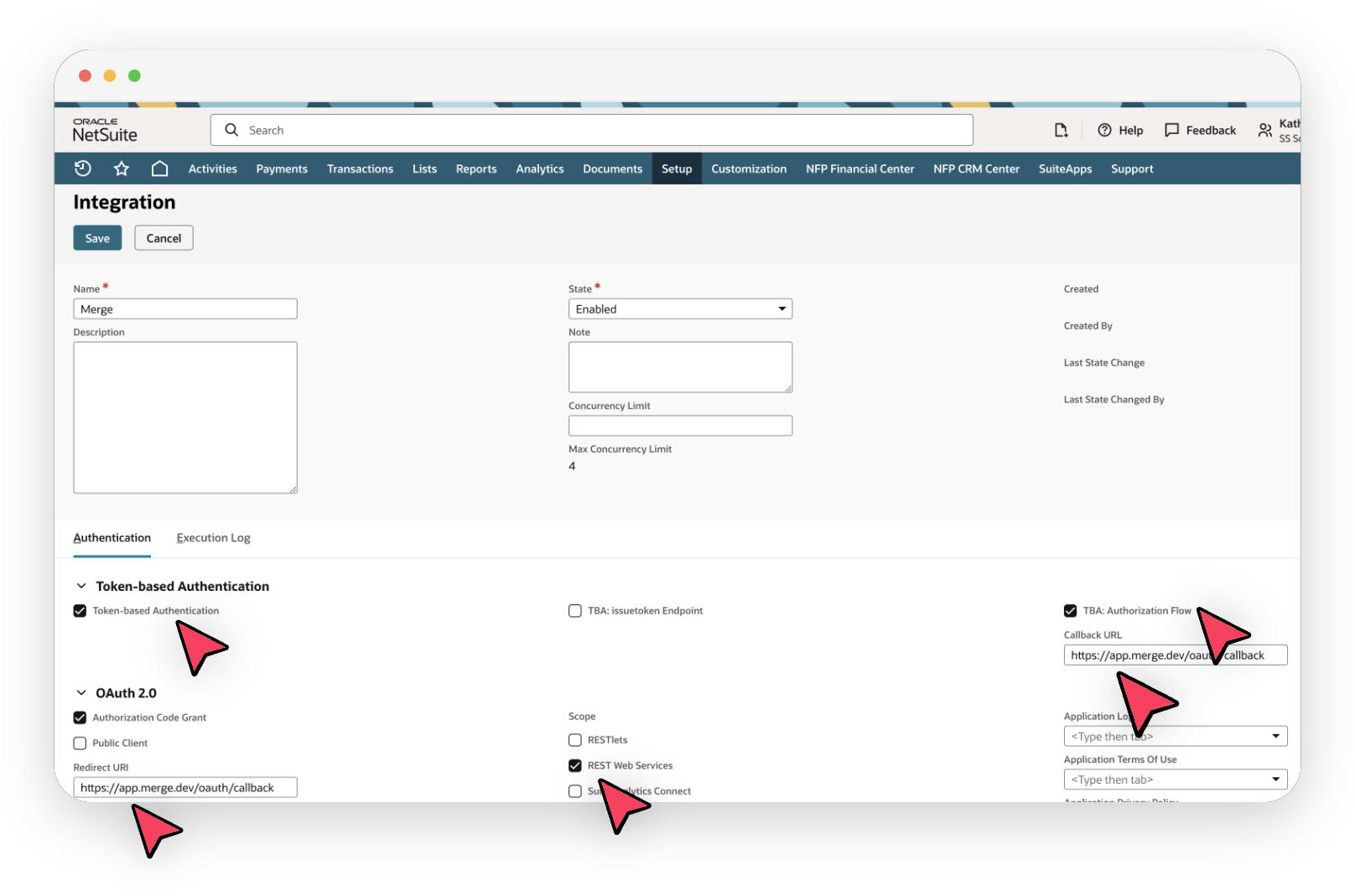 Similarly, we register external services with our NetSuite instance by creating an Integration. We’ll use this to register Merge with us, and get credentials that we’ll pass to Merge down the line that it will use to make authenticated requests to our NetSuite instance.