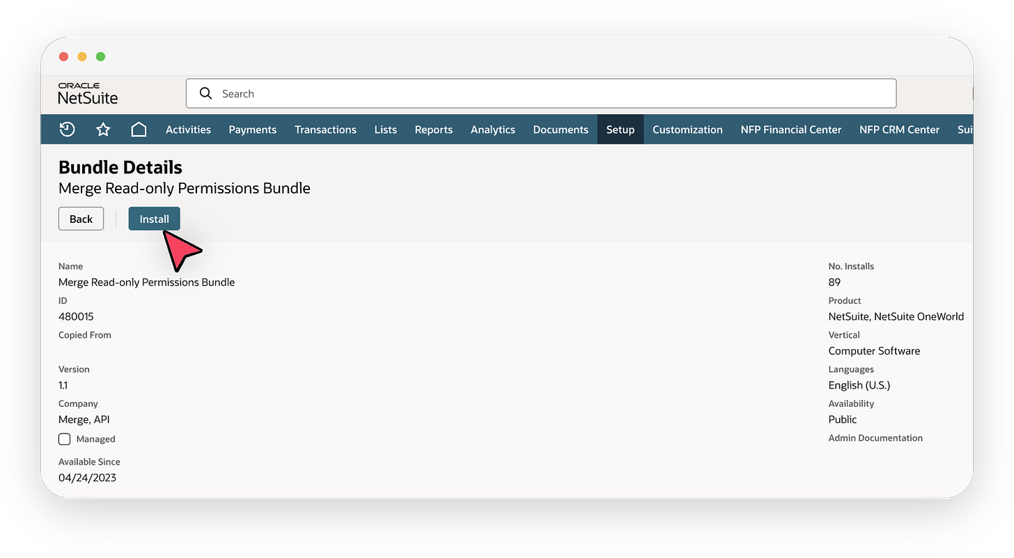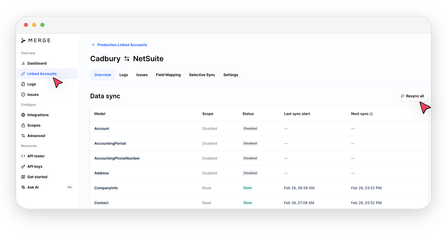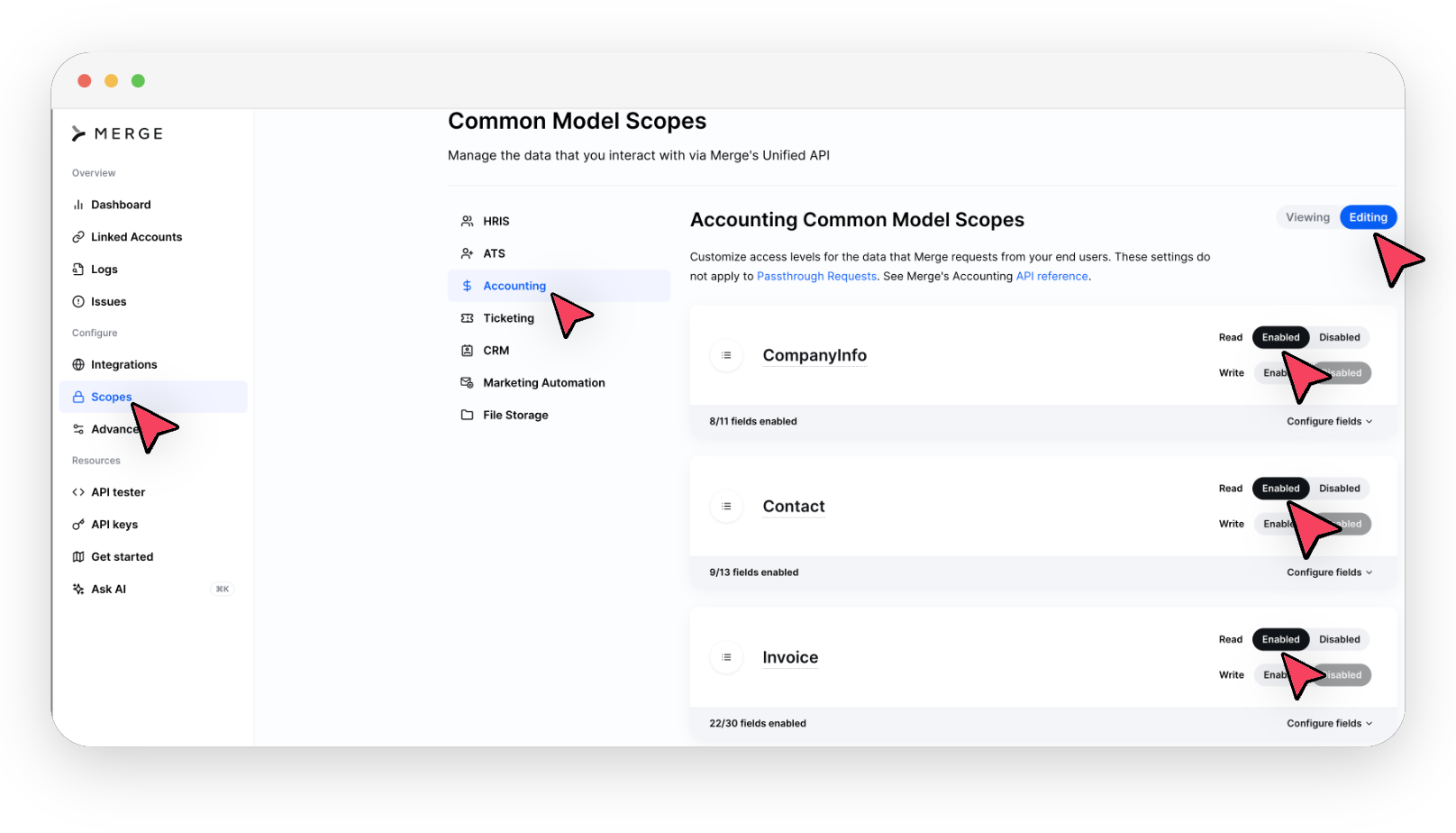 Let’s tell Merge what kind of data we want to sync from NetSuite. Go here and enable read-only access to CompanyInfo, Contact, and Invoice: