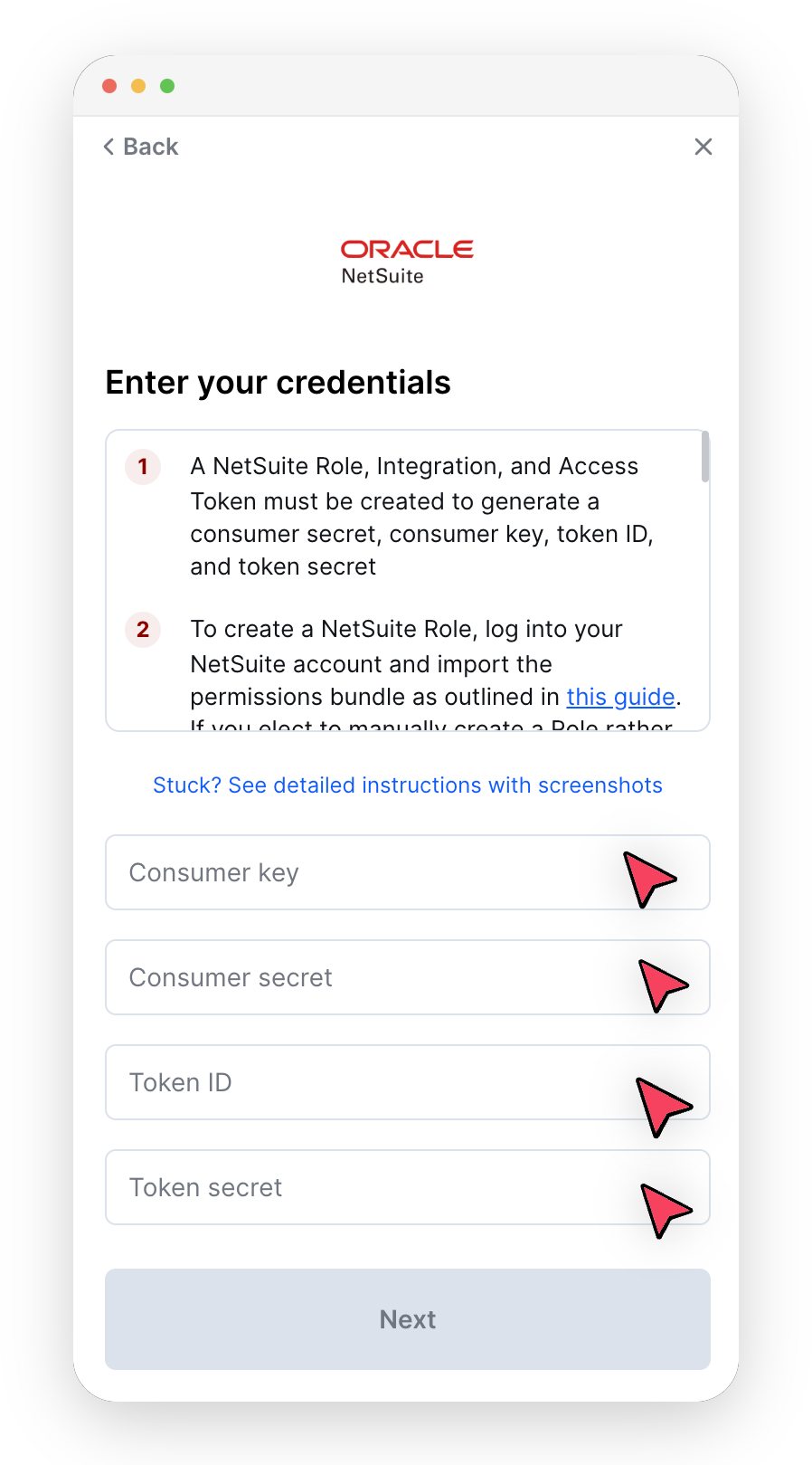 One you click “Generate URL” and go to the link, you’ll enter a Plaid like experience. Select the integration (NetSuite), confirm you’re an admin, confirm you’ll get access to invoices, company information, and contacts. Put in the ID of your NetSuite instance.