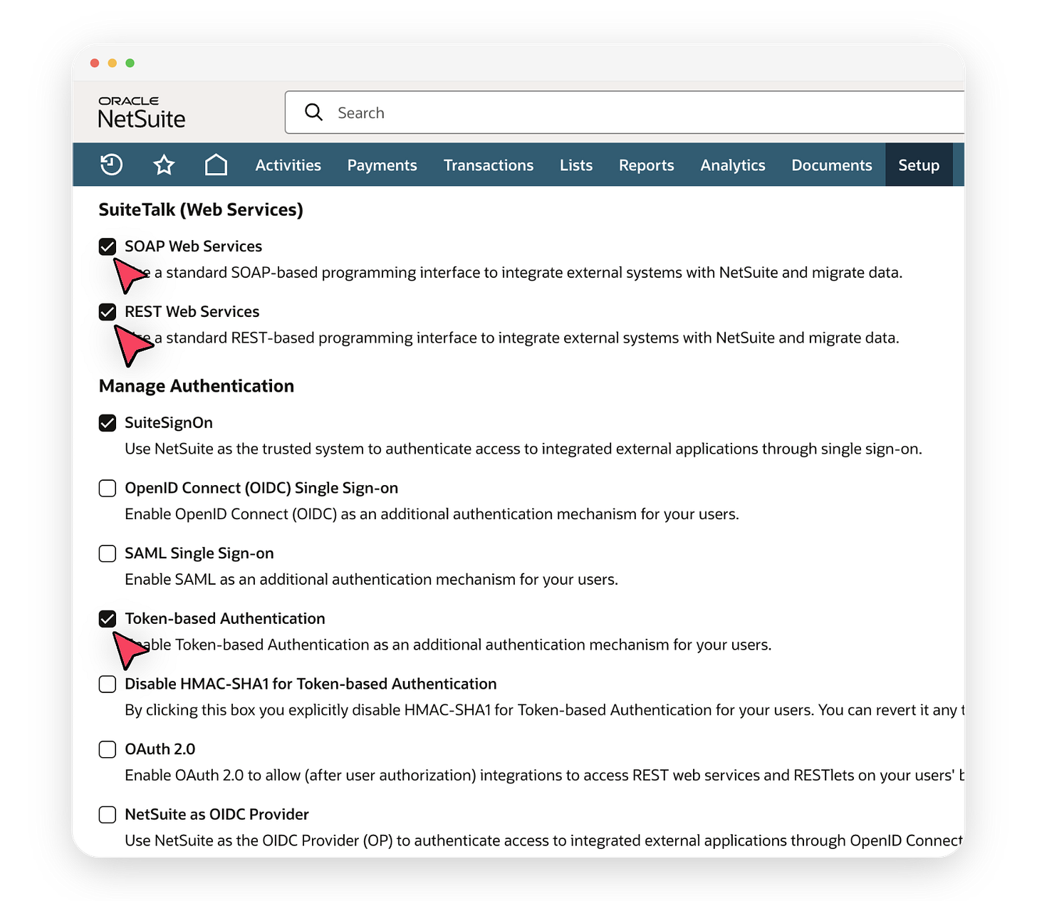 Go to Enable Features (Company→Setup→Enable Features). Click on the “SuiteCloud” tab. Check the boxes for “SOAP Web Services”, “REST Web Services”, and “Token-based Authentication”.