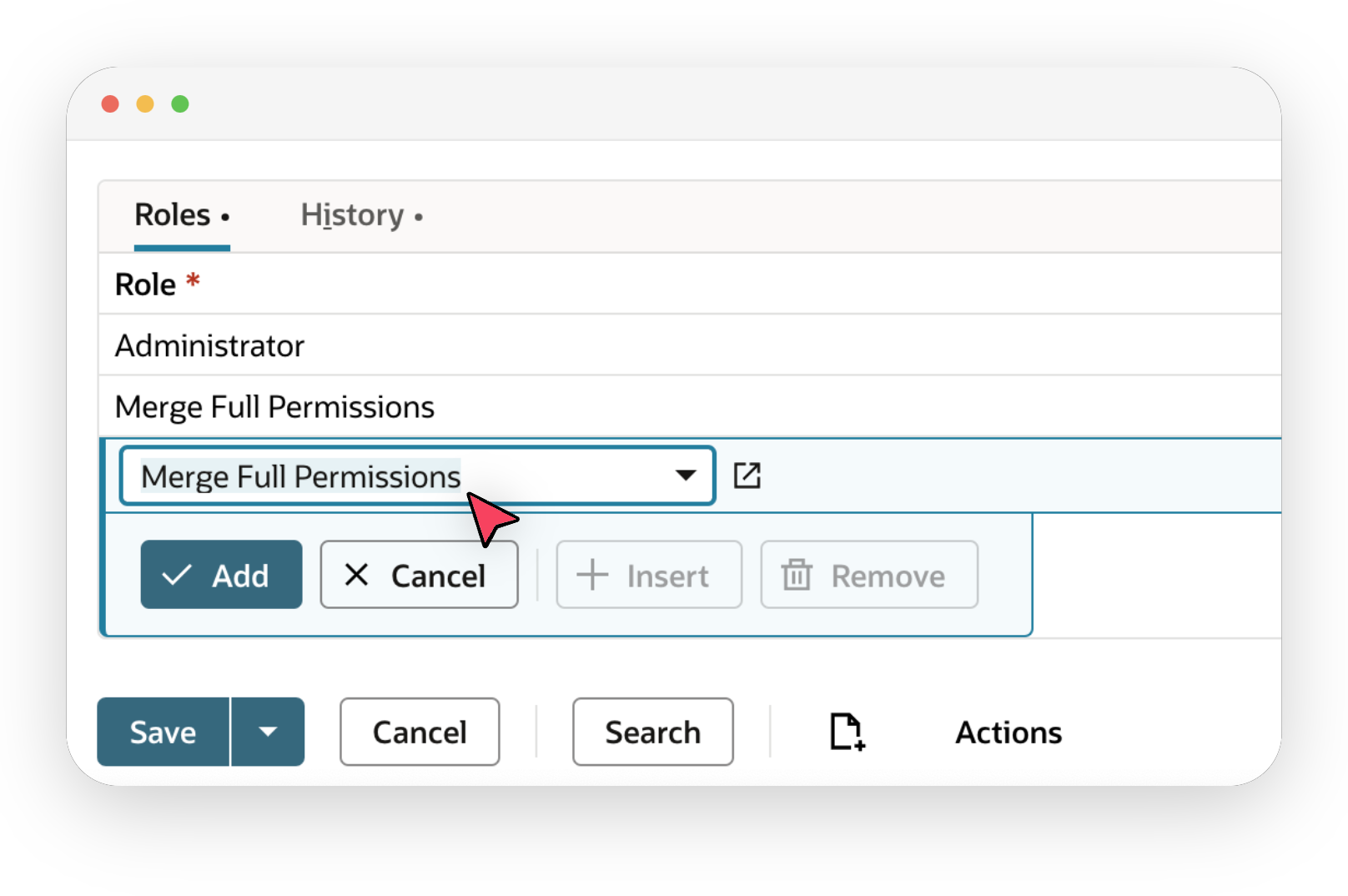 Now that we have a role, let’s assign a user to it. Go to Manage Users (Setup→Users→Manage Users) and select a user (I picked myself). Go to the “Access” tab and select the “Merge Full Permissions” role.1